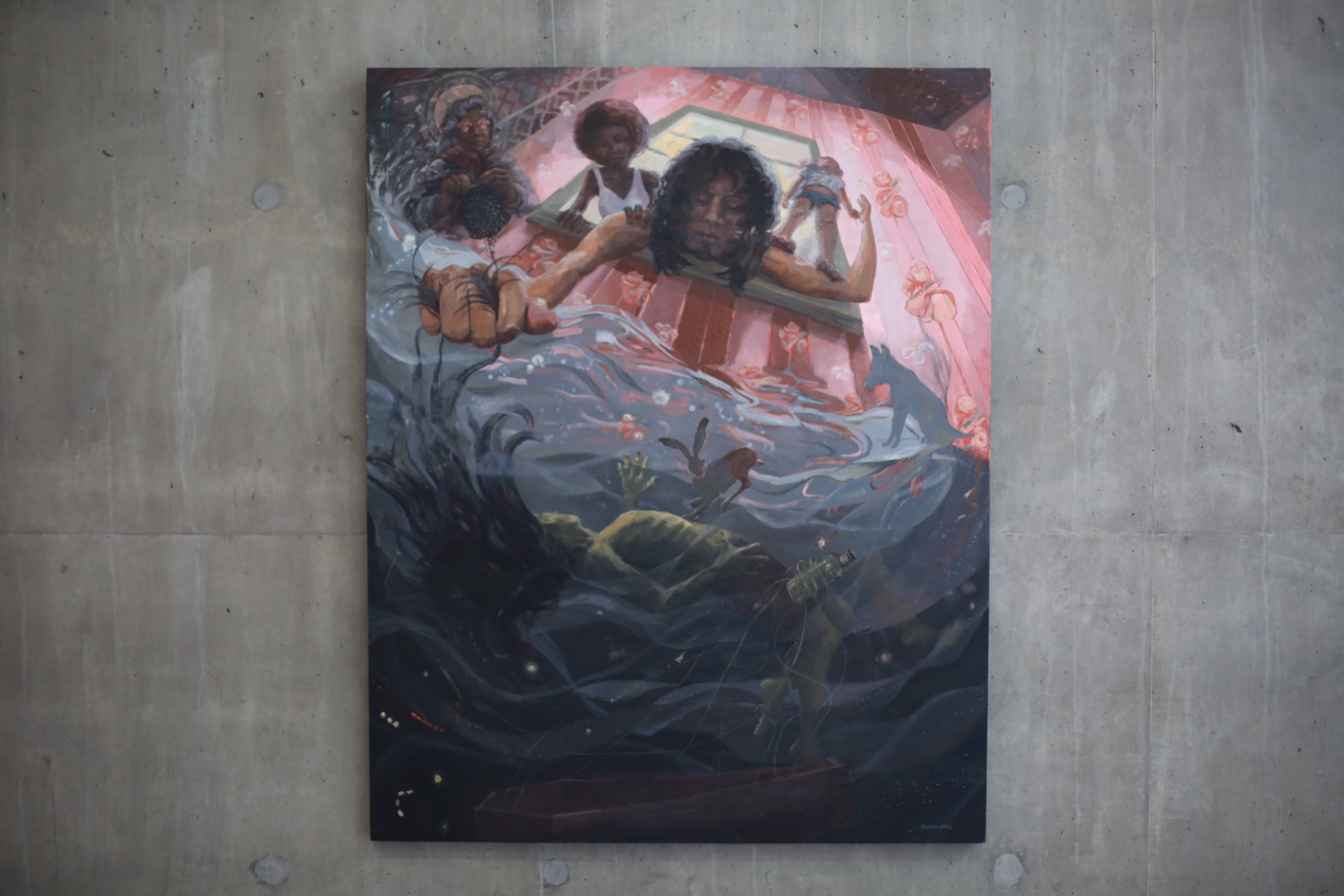 The project developed through a dialogue between artistic practice and research focused on substance use disorder and therapeutic support systems. Personal iconography and narrative painting techniques were used to translate complex emotional and social dynamics into a single visual moment. Collaboration centered on aligning lived experience, clinical insight, and visual storytelling to create a work that remains grounded in both personal reflection and research-informed understanding.