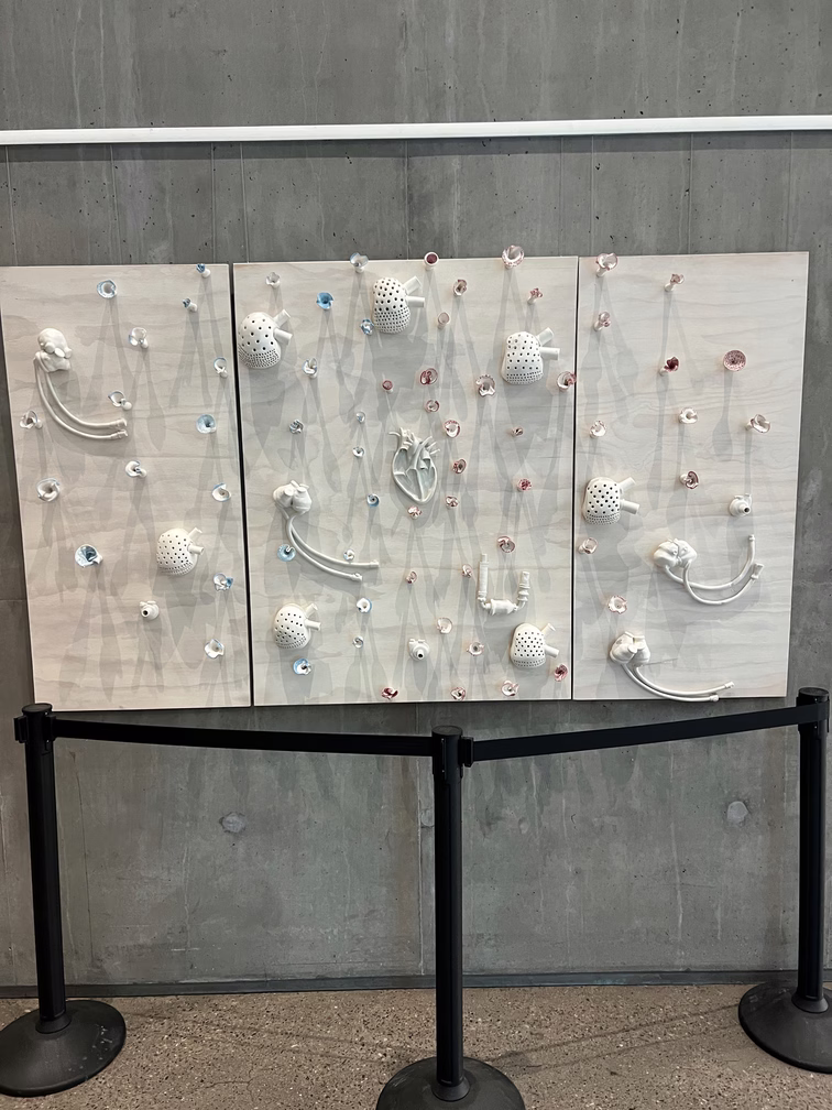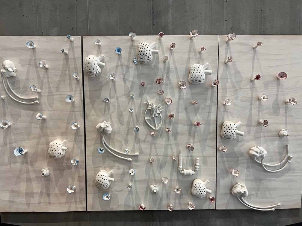 In this wall installation, numerous cardiac assist devices and artificial hearts have been sculpted. Some of these devices are the SynCardia Total Artificial Heart, Carmat Heart, a Biventricular Assist Device (BiVAD), Left Ventricular Assist Device (LVAD), a Tandem Heart, and a profile view of a sculpted heart to show the various Atriums and Ventricles. Interspersed in between the devices are organic forms that are circular in shape with some floral texture to celebrate the invention of these cardiac devices, the efficiency and complexity of the heart; its importance in the intricate processes of circulating blood and oxygen throughout the human body. The organic floral forms have red and blue dotted glaze on them to help symbolize the functions of the different sides of the heart and the red blood cells with and without oxygen.