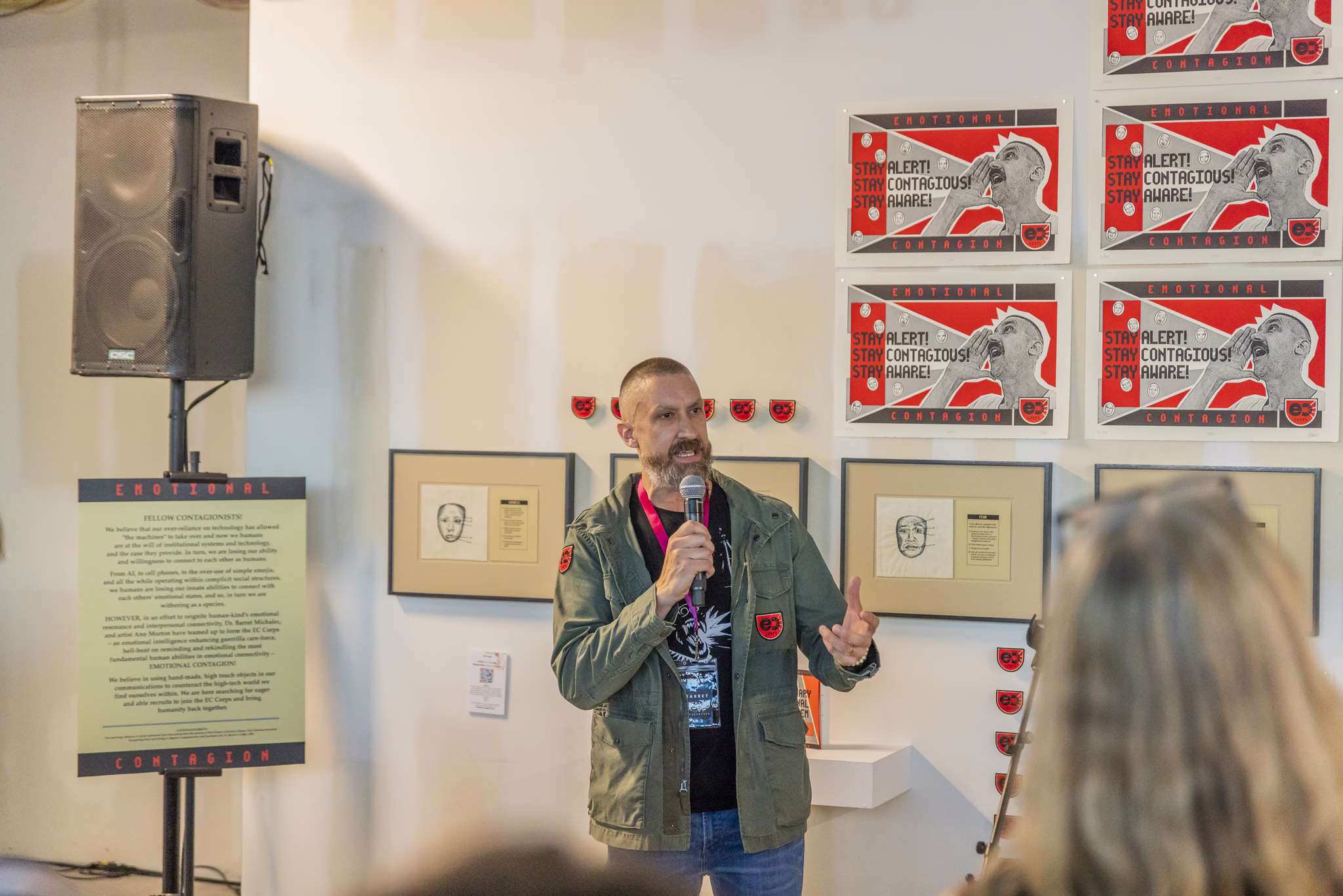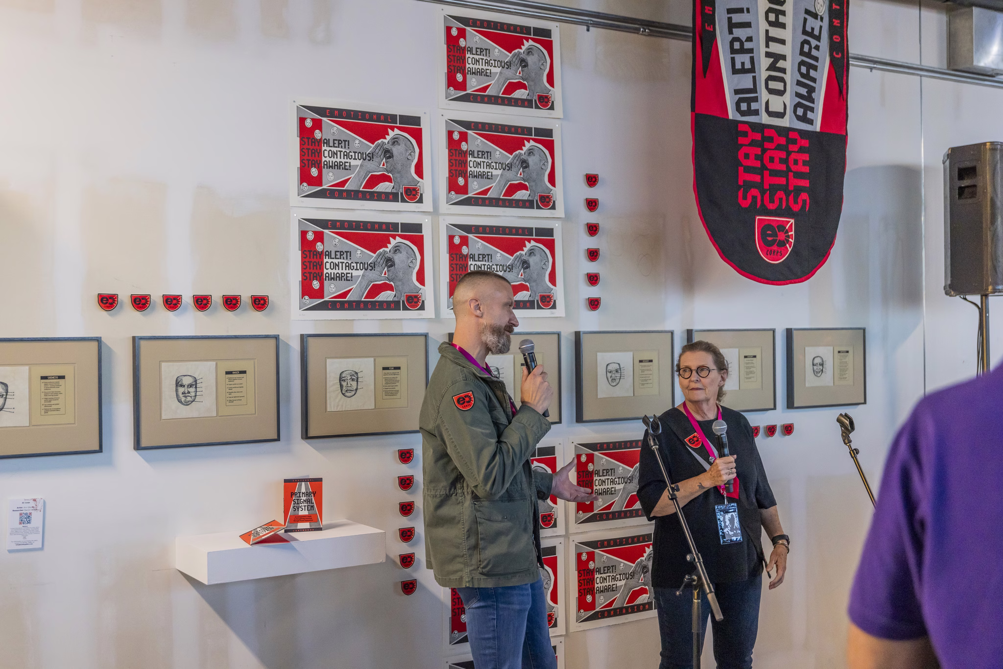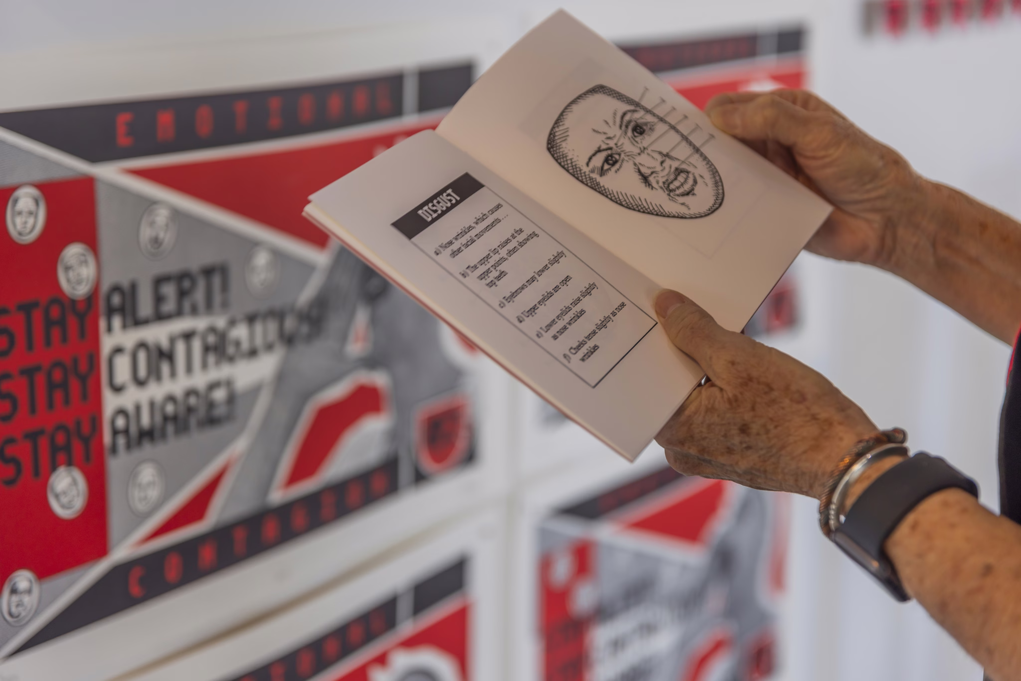 These ideas informed the creation of a collection of objects that collectively establish the persona of a fictional resistance group named the Emotional Contagion Corps. The installation imagines a clandestine meeting space where followers, referred to as Contagionists, gather. The environment includes banners, embroidered symbols, posters, pamphlets, and patches that communicate the language, structure, and values of the group. The work presents research concepts through material culture while reflecting the tone and progressive character of Michalec’s communication style.