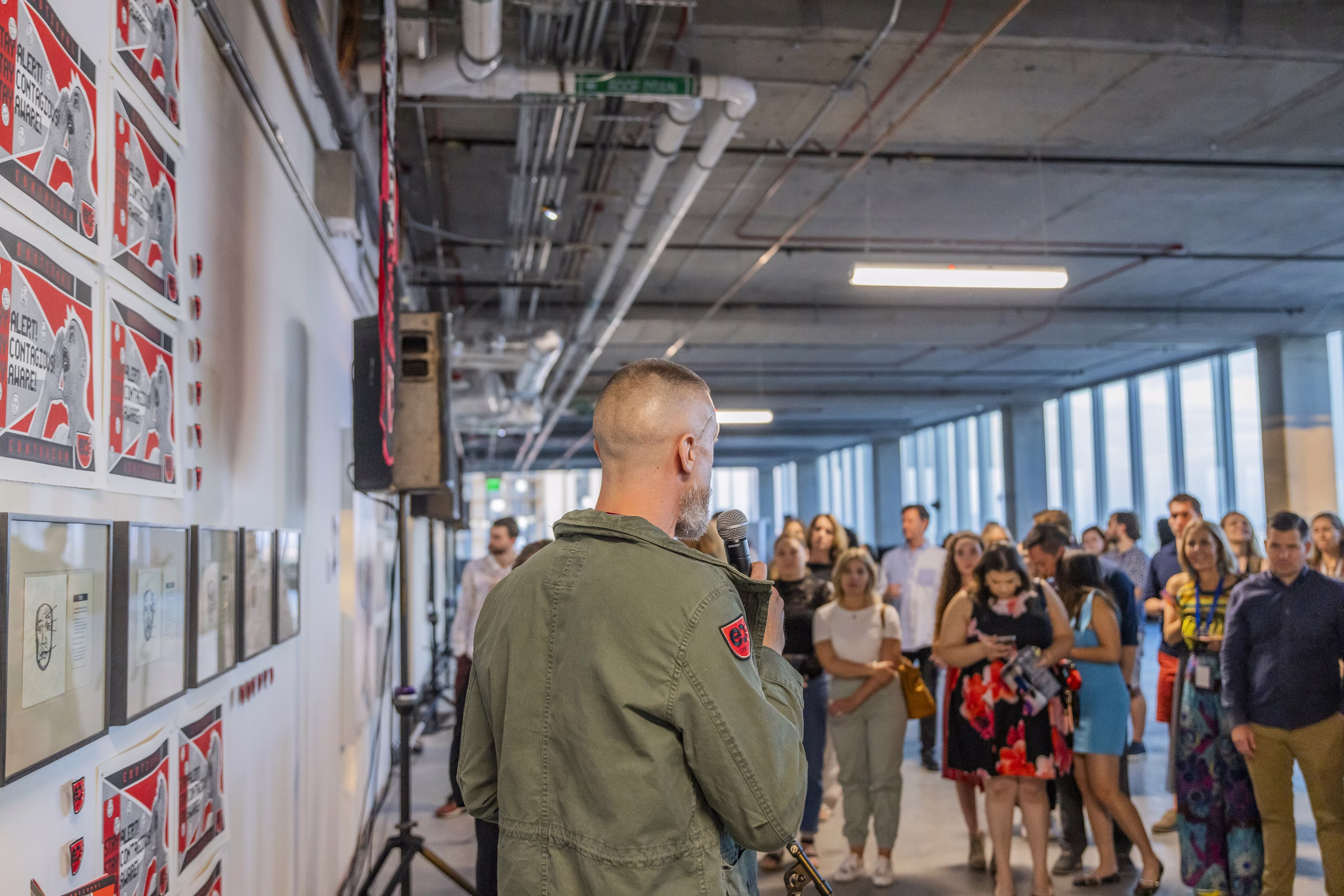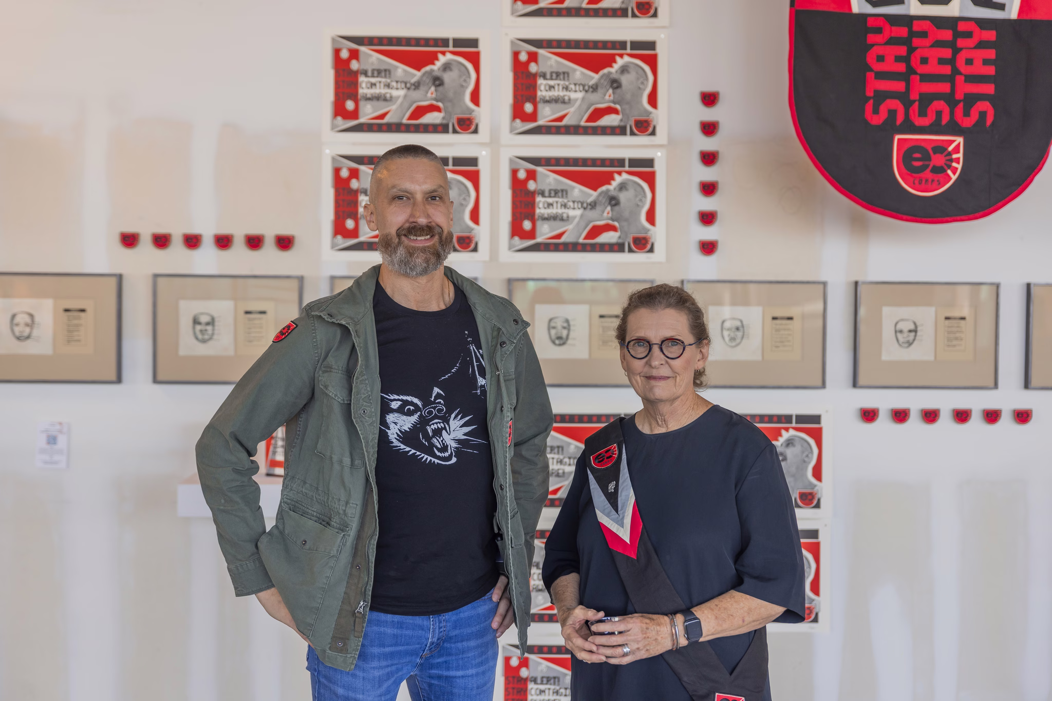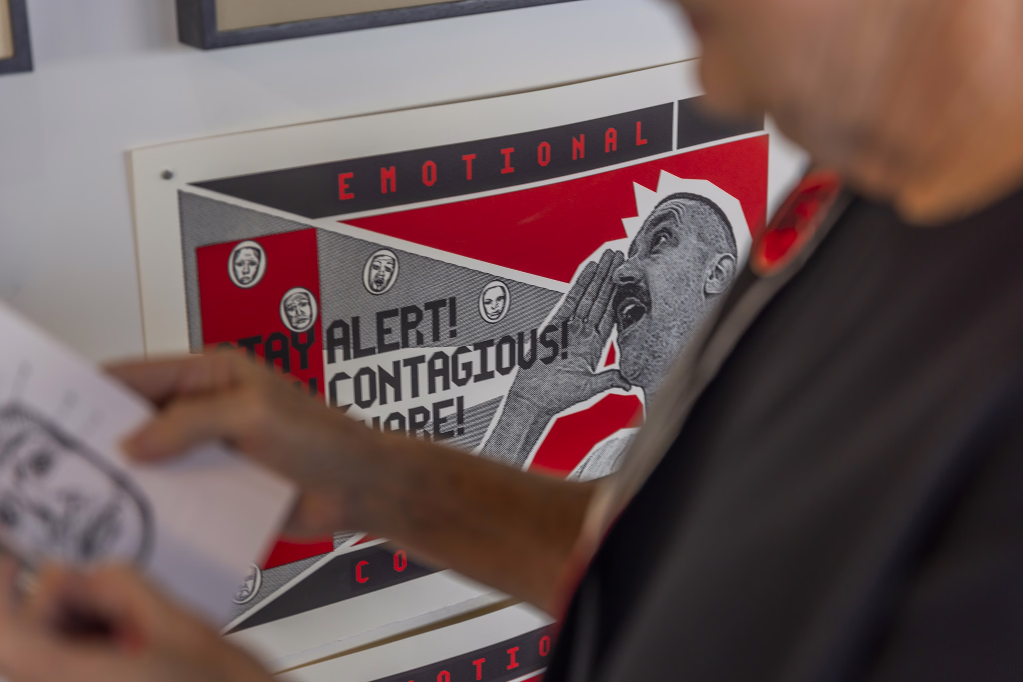 These ideas informed the creation of a collection of objects that collectively establish the persona of a fictional resistance group named the Emotional Contagion Corps. The installation imagines a clandestine meeting space where followers, referred to as Contagionists, gather. The environment includes banners, embroidered symbols, posters, pamphlets, and patches that communicate the language, structure, and values of the group. The work presents research concepts through material culture while reflecting the tone and progressive character of Michalec’s communication style.