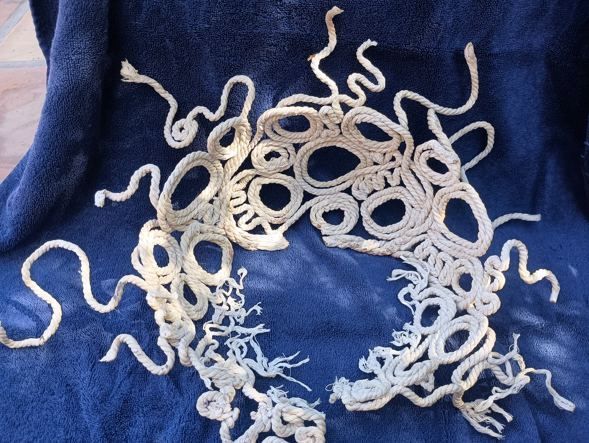 Iterative Growth presents a tree of life placed atop a pedestal perforated with holes representing histones, each wrapped with painted DNA. The pedestal’s eight sides reference the eight proteins that make up every histone. On one side, looping circles of rope represent healthy histones, whose stability supports strong roots and foliage shaped like brains. This side reflects how properly functioning histones sustain life, growth, and possibility.