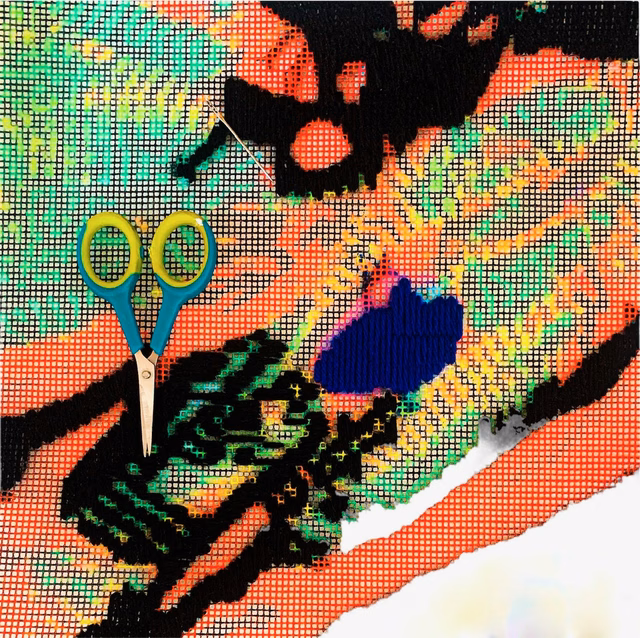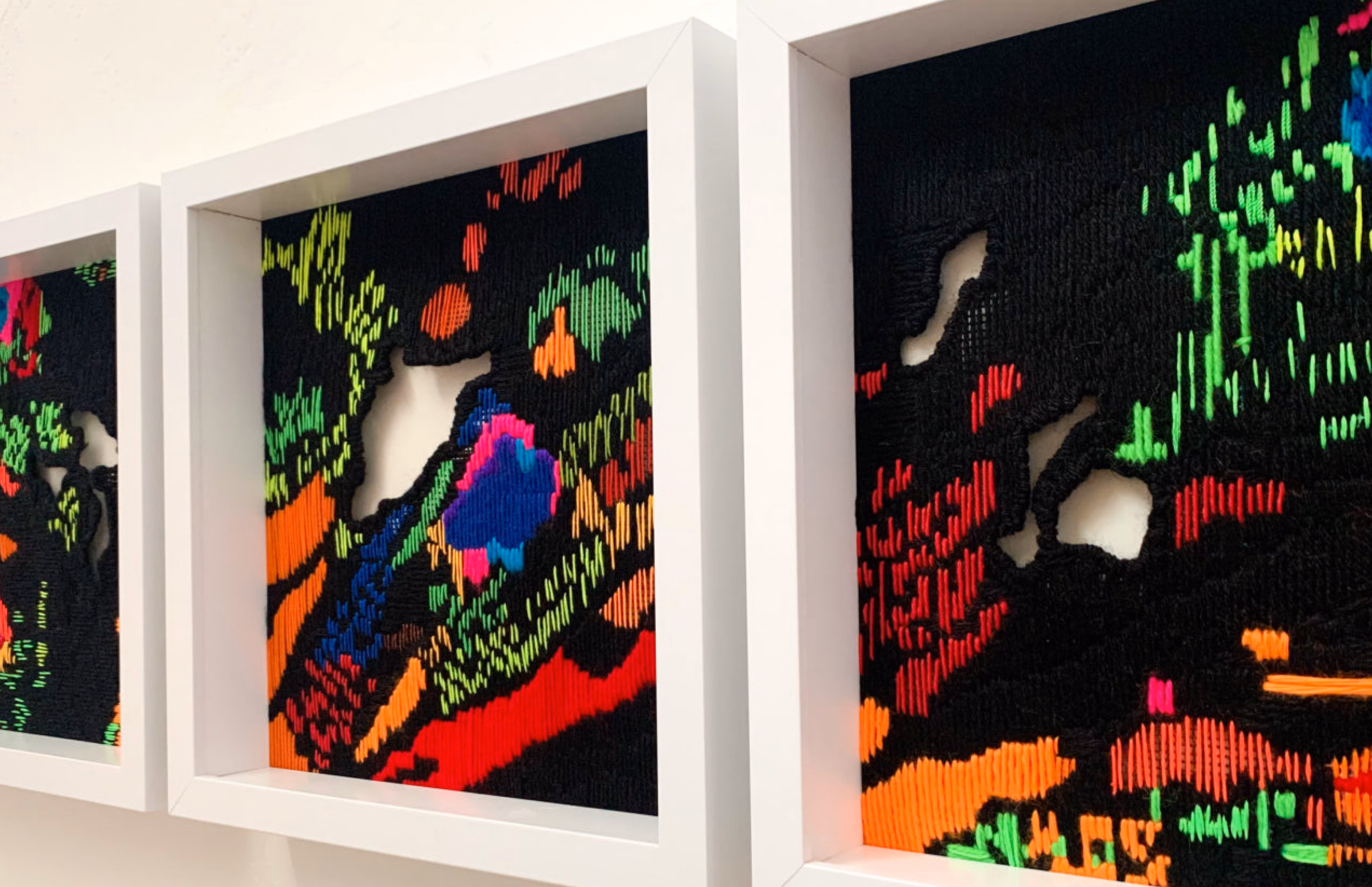 Medium: Assorted embroidery threads, yarn, paint on mesh