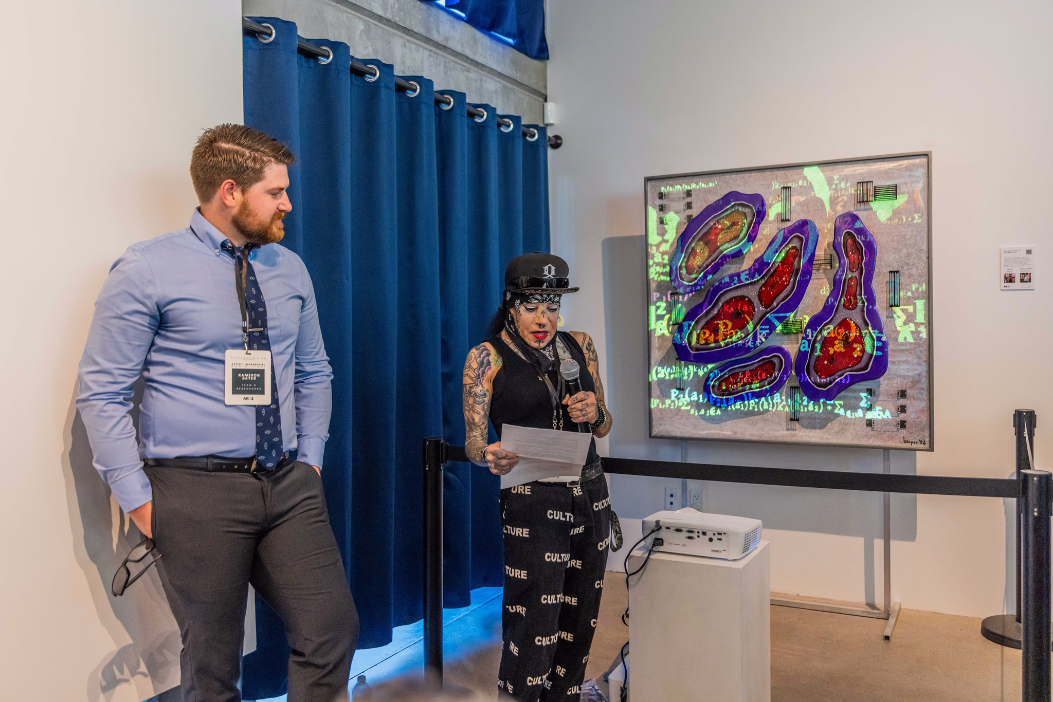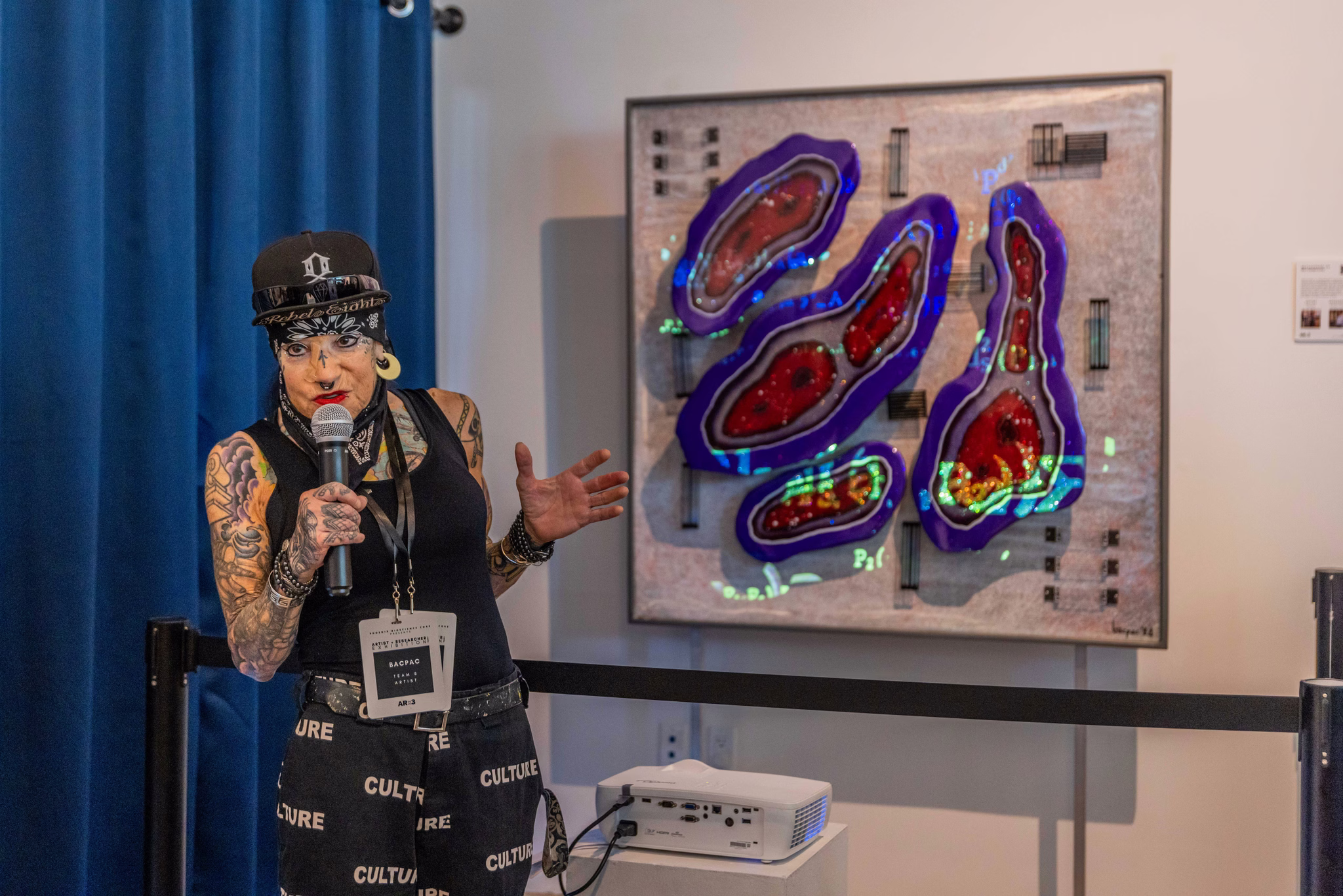 Metastasize vs Mathematize is a mini mural composed of an aluminum frame and panel with a metal flake finish. The work depicts a tumor composed of mutant cells and flow cells, overlaid with an animated projection of a mathematical formula developed to detect mutations at an early stage.