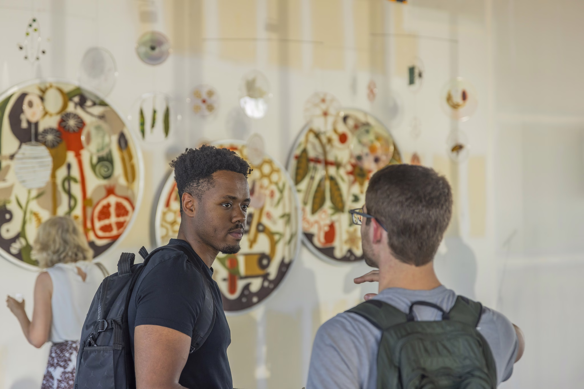 Specifications: Work consists of four components: Three felted wool panels and a mixed-media mobile. Each round panel is 46” in diameter and the mobile approximately 13 feet